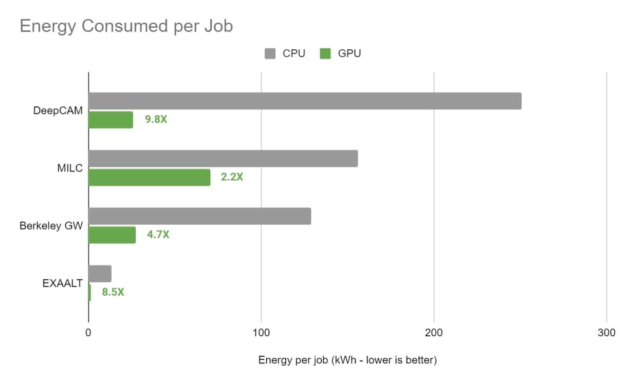 Researchers found that the apps, when accelerated with the NVIDIA A100 GPUs, saw energy efficiency rise 5x on average (see below). One application, for weather forecasting, logged gains of nearly 10x.