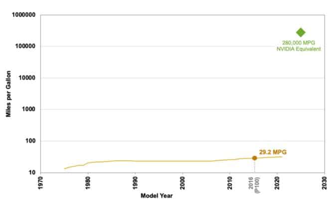 The analysis applies to the fuel efficiency of cars NVIDIA’s whopping 10,000x efficiency gain in AI training and inference from 2016 to 2025 (see chart below).